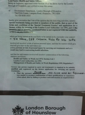 The popular JK Nails shop on Chiswick High Road is closed at present following a visit from Hounslow Council officials. Health and Safety inspectors posted a notice in the window on Thursday. The nail bar is one of the most popular in Chiswick, with manicures, pedicures and other beauty treatments available at modest prices. The poster from LBH advised that persons found on-site during the investigation were not registered and were unable to produce confirmation of their qualification or experience. This is part of the terms and conditions of the 'Special Treatment Licence' needed to practise such treatments. The Council notice advised that failure to comply could put persons at risk and could lead to them "contracting health infections".