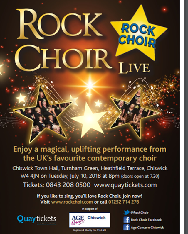 Rock Choir Chiswick are performing at Chiswick Town Hall on Tuesday 10 July at 8pm in aid of local charity, Age Concern Chiswick. Chiswick Rock Choir leader Katy Seath explains. “‘It is very special for the choir to be able to sing in the heart of the town and also help raise funds for an important local charity. The members have been working hard and we know it's going to be a brilliant evening full of uplifting music and feel good moments”. Age Concern Chiswick is a small independent local charity which has been serving older people in Chiswick and Brentford for over 60 years. It is run entirely by a team of dedicated volunteers, with no central or local government funding. Their principal aim is to combat loneliness and isolation amongst older people by bringing them together in a welcoming and friendly atmosphere. They host a friendship club twice weekly at their own premises in Oxford Road North, where members can join in various activities – keep fit, bingo, a craft group, talks, occasional tea dances and buffet lunches, and more. They also serve light refreshments, and members can enjoy a good chat over a cuppa. “The members of Age Concern Chiswick are enormously grateful to Rock Choir Chiswick for supporting our charity through this concert. These wonderful singers really embrace the true meaning of community. Many of our members have lived locally for all their lives and have witnessed numerous changes in their neighbourhoods. They are so very touched that Rock Choir Chiswick's concert will draw people together from across the generations, helping to ensure that our society remains inclusive and welcoming at every age. Thank you Rock Choir Chiswick!" said Mrs Jean Silva, Chair of Age Concern Chiswick. Doors open at 7.30 pm, when drinks will be available. Tickets are on sale now at www.quaytickets.com. 0843 208 0500. A collection in aid of Age Concern Chiswick (registered charity number 1164423) will be taken at the end of the concert, and there will be an opportunity to donate via a JustGiving page. More information on: www.rockchoir.com or email ageconcernchiswick@talktalk.net