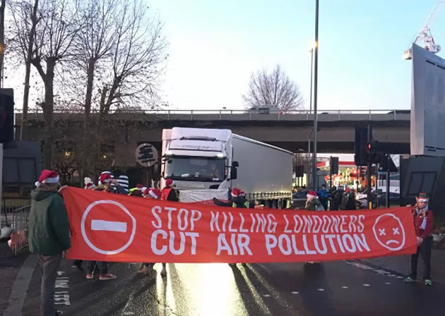 Traffic was disrupted during the morning rush hour on Monday (18 December) when a group of anti-pollution demonstrators blocked Chiswick Roundabout and unfurled banners. Supporters of the Stop Killing Londoners campaign, some wearing Santa hats and tinsel, were protesting against air pollution in the capital. They were demanding more action from Mayor Sadiq Khan and the Greater London Authority on the issue, timing their protest to coincide with the end of a consultation on air pollution. Traffic quickly became gridlocked as vehicles were prevented from driving through the demo. Police were called to the scene and asked the demonstrators to move aside. No arrests were made. Protester Roger Hallam said, "All of our peaceful direct actions are done to bring an end to the 9,000-10,000 Londoners being killed every year due to toxic and unlawful levels of air pollution, and the thousands of others whose lungs are being poisoned and scarred for life. Despite our meeting with Ellie Robinson who works directly with the Mayor and Elliot Traherne, who is one of the leading civil servants advising on matters of air pollution to the Mayor, we still have no assurance that the Mayor takes this emergency seriously enough to meet with us." Stop Killing Londoners has said it will organise non-violent direct action road blocks across the capital until politicians commit to an 80% reduction in pollutants. A police spokesperson said, "Police were called at 07:42hrs on Monday, 18 December to reports of demonstrators causing an obstruction at Chiswick Roundabout. Officers attended and the demonstrators were relocated to a safer location."