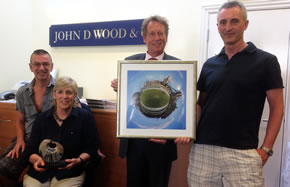 Photo; Joanna Brendon From left: Keith Davidson, Louise Mock, Derek Fletcher, Murray Crawford An important element of the weekend is the John D Wood & Co Prize Draw; anyone visiting 8 or more studios is qualified to enter, with a chance of winning a token to spend at any of the participating studios. This year, the winner was Murray Crawford. When he moved to Chiswick in 2010, he quickly became an enthusiast of Artists at Home and last year he made a record-breaking tour of all the studios. This year, he took in 40, so the organisers were delighted when Derek Fletcher, Associate Director of John D Wood & Co pulled his name out of the bag at the draw. Murray writes: I was very pleasantly surprised by the high standard of the art in my local area and bought my first piece from at an artist in the road where I live. Visiting all 54 homes (in 2012) was quite a feat, but I thoroughly enjoyed every one as it was like attending a series of house parties with very friendly very talented and interesting hosts. I am so grateful to John D Wood & Co for sponsoring Artists at Home and I commend this lovely and inspiring weekend to everyone in our local area. Derek Fletcher says: “I have been associated with Artists at Home for ten years and have enjoyed seeing the organization flourish. It is an integral part of the cultural life of the area and I am proud that John D Wood & Co are the principle sponsors” Murray has chosen to spend his token on Smoke-Fired SpiralForm , a ceramic sculpture by Louise Mock and Tower Bridgeand London Assembly Building, a circular panoramic print by Keith Davidson.