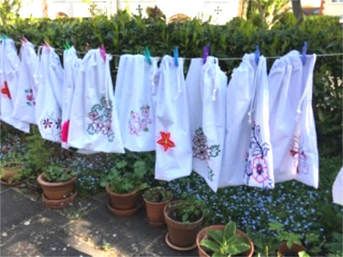 A Chiswick seamstress has been doing her bit to help NHS workers by converting pillow cases into scrub bags. Lorna had been putting her skills to good use by making them into something that could be used to safely transport and launder their uniforms; also scrub caps and headbands. Finding there was no demand at the nearest hospitals she joined Sewing 4 Kingston, part of the Surbiton Coronavirus Community Response Group, which is now supplying many hospitals including West Middlesex plus care homes, the police & ambulance services. When the Grove Park Bridge Group heard of the work she was doing they got together to find extra pillow cases for her but one of their members came up with a very special idea. Dinah Wiener is a founding trustee of Bhola's Children (www.bholaschildren.org) a UK registered charity set up in March 2007 to provide a permanent source of funding for a home and school for orphaned and disabled children on the island of Bhola in the Bay of Bengal. All the children are taught daily living skills, primary education and given training in tailoring, cooking, woodwork and other technical skills. They are taught how to make clothes and table linen by hand-sewing or with a sewing machine and also how to decorate with embroidery. Each year Dinah brings back to Chiswick pillow cases hand-embroidered by the children which she gives away in exchange for donations to Bhola's Children at open days at her house for parishioners of Our Lady of Grace and St Edward church and other local friends. As this would be impossible this year she has presented all the pillow cases to Lorna. It is hoped that the lovely embroidery will be an extra comfort to NHS staff at this time. Lorna says that if anyone would like to sew or donate material they should look for their local Scrub Hub, Sewing 4 the NHS, For the Love of Scrubs or similar group.