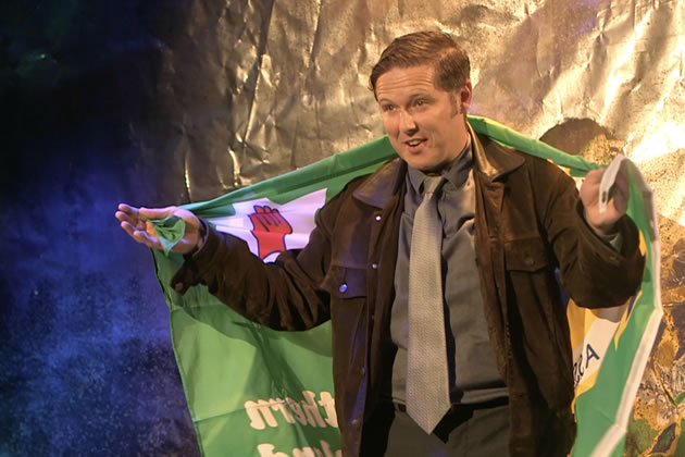“A NIGHT IN NOVEMBER”, now on at the Chiswick Playhouse, is the 25th anniversary production of MARIE JONES’s searingly poignant yet excruciatingly witty and perceptive monologue-drama. On the first night the studio theatre was sold out for this one-man show that stars the phenomenally brilliant MATTHEW FORSYTHE, playing Kenneth. He was a tour de force as he held the packed audience, by the seat of their pants, throughout the drama. The main character Kenneth struggles with his national identity as a British Protestant, during The Troubles in Northern Ireland, at the time of the 1994 FIFA WORLD CUP. He works as a Dole Clerk, believes he is happily married to Debrah and all his life has discriminated against Roman Catholics. However, his attitudes change during that “Night in November” when he drives himself and Ernie, his bigoted father-in-law, to watch Northern Ireland play the Republic. Kenneth observes and recoils at the sectarian hatred of the Protestant crowd towards the winning Irish Republic team. Kenneth is ‘over the moon’ as he has been recently accepted as a member of the local golf club. Whereas Gerry, his laissez faire, good humoured Catholic boss, has been rejected. Friends are invited by Debrah, his wife, to celebrate the event. FORSYTHE nimbly creates the party guests: he darts from battle axe Pauline to Stewart (who revels in ‘a bit of blue’} to the confused couple Brenda and Malcolm returning again and again to pinch mouthed Debrah. It is a treat to observe his perfect timing and pace delivered with panache. His eyes transform in a nano second from, being Debrah the Rottweiler to the bewildered Kenneth. Matthew McElhinney’s deft, fluid direction, is faultless. He is the son of the writer Marie Jones and was five years old when she wrote the play in 1994. Garth McConaghie’s spot on ‘effects’ add authenticity: the car revs up convincingly, the flush of he lavatory transports us to the bathroom, and the chanting football crowd makes us feel as if we are in the football stadium rather than a small theatre. Chris Hunter’s set is simple yet so effective particularly when it twists at the end. I assumed the ‘box set’ was discarded Amazon boxes but if it was, it was well reinforced. Matthew jumps on it vigorously. Conleth White’s lighting adds depth to the small stage. In fact, one of the audience commented that the stage seemed bigger than usual! Gradually Kenneth morphs into a re-born man. We participate in this as we are sucked into a kaleidoscope of actions witnessing his journey of self discovery and sharing, through the medium of the monologue, his realisation that his marriage and lifestyle has disintegrated: ‘I am free of them Mick. I am a Protestant, but I am an Irishman.” He is no longer imprisoned by his environment. AND THEN… When we think it is all over. A stunning finale. The audience, every one of us, rose from our seats like a Hokusai wave… But you will have to be in the theatre to know the outcome! I feel for all those Kenneths in this world who realise their life sentence is to be stuck in a repetitive job often meaninglessly working for ‘bread on the table’. However, if they break free as our Kenneth did, without a penny in his pocket, what will they do? He found security in Jack’s Army and revelled in the fact that at last he was ’One of the Lads’ and they would take care of each other. As Kenneth sang, “Reaching out, touching me, touching you” from the song ‘Sweet Caroline’ the words have never seemed so good; they resonated and connected the audience with the liberated Irishman on that night in August in the Chiswick Playhouse Studio Theatre. Tip: Buy your tickets ASAP and revise the lyrics of Sweet Caroline! Susan Stanley-Carroll ‘“A Night in November” finishes on 3 September. Book tickets here or by contacting the Box Office at info@chiswickplayhouse.co.uk.