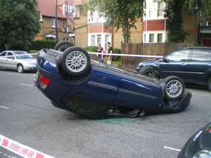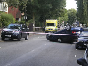 A car was left upside down after striking another vehicle on the Avenue in Chiswick this evening (Saturday 10th July). According to emergency services staff at the scene, the driver has not been critically injured. The airbag was deployed and the car radio could still be heard playing from upturned vehicle. The incident is believed to have occurred at about 7pm. At this stage it is believed that the car was travelling along the Avenue when it struck the side of another vehicle travelling in the opposite direction. The Avenue is currently (8.30pm) closed to traffic and the E3 bus is being diverted. There are problems further up the bus route due to a serious stabbing incident near the Gala Bingo Hall on the Uxbridge Road in Acton at around the same time.