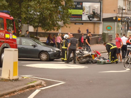 Picture: Mike Abbott London Ambulance Service and London Fire Brigade attended the scene. The motorcycle was carrying a female passenger who is reported to have been unhurt in the collision. The male cyclist was treated at the scene but eye witnesses say that he was able to walk to the ambulance. The police have not made any request for witnesses to the incident at this stage.