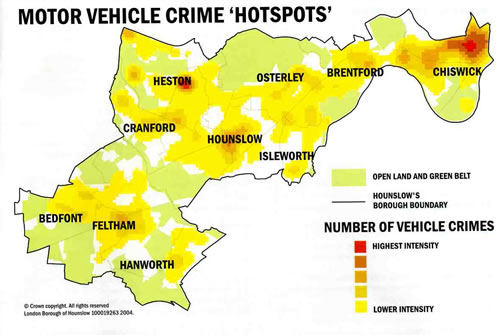 A new map of the borough showing 'hotspots' for local crime has starkly illustrated the scale of the current problem with vehicle crime in Chiswick. The map, produced by the Hounslow Community Safety Unit, and reproduced below, clearly indicates that the area is the worst affected in the borough for this type of crime. There is a strong local feeling that the main reason that this type of crime is such a problem is that groups of youths are allowed to ride through the area on bikes peering into cars for items to steal. One local resident said of the issue , 'our streets are being patrolled by feral and malevolent jackals'. A senior police officer told ChiswickW4.com that they were very aware of the concerns of residents about car crime and the 'boys on bikes' issue. An analysis has been done of the problem and the figures show that there hasn't been a significant increase in this kind of crime. The police believe that rising public concern about the problem is partly down to residents sharing their experiences on the discussion forum on this site.