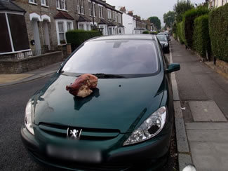 The car had diplomatic registration plates which suggested that it is driven by someone who works for the French Embassy in London. Last month two pigs' heads were found hanging at the entrance of a mosque in Montauban southern France. It was the latest in a series of incidents that Muslim leaders in France say reflects rising Islamophobia in the country. The use of a pig's head in this way would usually intend to offend the religious sensibilities of either Muslims or Jews. Four days ago, Simon Parkes, a former soldier who tied a pig's head to the gates of a Cheltenham mosque was jailed for four months. He had also sprayed racist graffiti during the attack in November 2010.