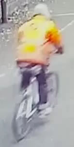 CCTV which shows the man approach the location on a pedal cycle with a white frame and stop on top of the stairs outside the door. He is then seen spraying yellow graffiti on the doors of the community centre before making off on his bike in the direction of Hammersmith Broadway. He was wearing an orange hi-vis jacket over a grey hoodie.