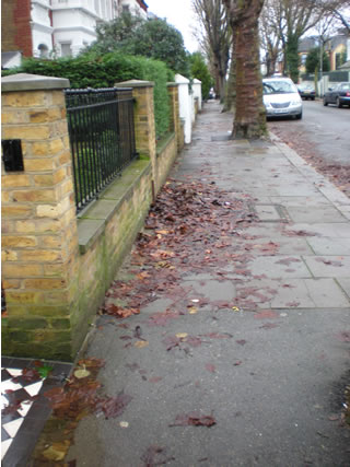 A Chiswick Councillor is asking for urgent measures to be taken about the build up of leaves on local pavements. John Todd said, "I was alerted by a pensioner attending the pensioners alone for Christmas lunch of how difficult she found walking on pavements where wet and slippery leaves have not been cleared. I have asked London Borough of Hounslow to to remove them as soon as possible." Cllr. Todd has sent us a number of photos of areas where the need for leaf clearance is particularly acute around Beverly Road and Fraser Street.