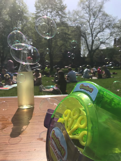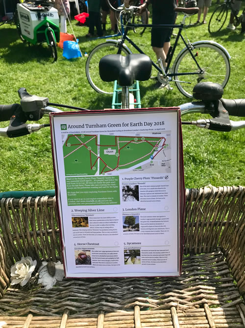 About 200 people took advantage of one of the hottest days of the year so far to join celebrate an "Earth Day Picnic" on Turnham Green Chiswick, jointly organised by Hounslow Cycling Campaign, Abundance London and Friends of Turnham Green. Earth Day is an annual global environmental celebration and this year's theme was "End Plastic Pollution" so people coming were asked not to bring single-use plastics. Abundance London provided seeds, elderflower cordial from local elderflowers and bubbles. Hounslow Cycling Campaign organised join-up rides from several locations to Turnham Green and the London Borough of Hounslow laid on "Dr Bike" for quick fixes and tune-ups and bike security marking. The Turnham Green ward officer from the Met Police passed on crime prevention tips. People were asked to come by walking, cycling and public transport and there was a diverse selection of bikes on display - a bike-powered smoothie machine, cargo bikes, trailer bikes, old post office bikes with the most unusual probably being an electric bike made from bamboo.