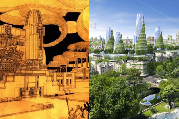 Left - Antonio Sant'Elia design for Monza Cemetery, 1912. Drawing. Avery Architectural & Fine Arts Library, Columbia University, New York. Right - Paris 2025, an ecological vision by Victor Callebaut