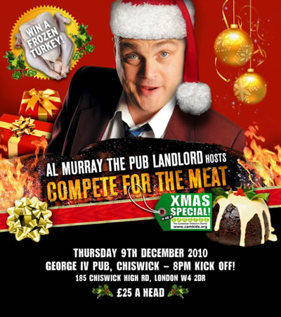 DUE TO HIGH DEMAND FOR THE 8 DECEMBER SHOW - AL MURRAY WILL BE PUTTING ON AN ADDITIONAL SHOW ON THURSDAY 9 DECEMBER. Tickets £25: http://www.seetickets.com/Tour/AL-MURRAY-S-COMPETE-FOR-THE-MEAT-XMAS-SPECIAL Address: George IV Pub, 185 Chiswick High Road, London W4 2DR December 2, 2010 |