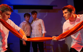 At first it's a laugh, and they're puppyish in their enthusiasm, the opening scene is funny, and they throw themselves into the action. It's loud, fast and frenetic with some terrific fight scenes, but it doesn't stay like that. As the play goes on, the atmosphere changes and things becomes less light hearted. The deeper they get into the play, the more the boys realise that there's more to life, love and sex than anything they've been told or have experienced; a revelation that affects them all in different ways, not least in the dynamics of their relationships with each other. Now, they're not just reciting Shakespeare's lines, they're absorbing them, blurring the lines between fiction and reality.