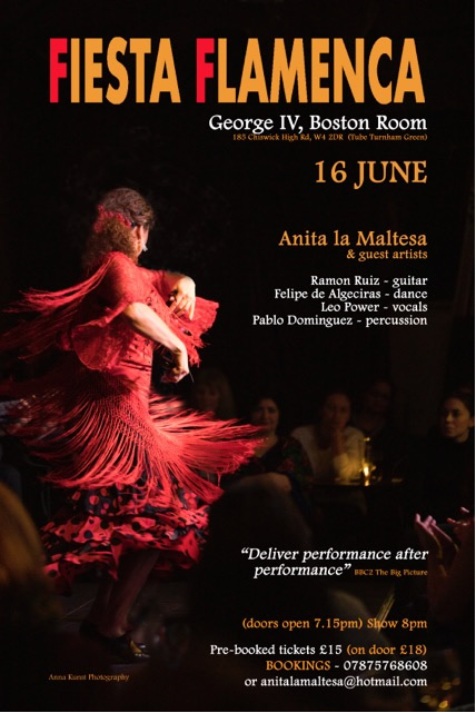 Anita La Maltesa (dance and vocals) and Ramon Ruiz (flamenco guitar) proudly present a spectacle of flamenco passion together with Leo Power on vocals and Pablo Dominguez on percussion. 185 Chiswick High Road, W4 2DR 8.00 pm (doors 7.15), Tickets £15 (on door £18) 07875 768608, anitalamaltesa@hotmail.com June 15, 2019 |