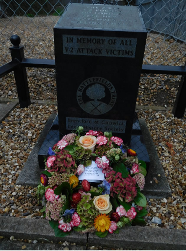The Brentford & Chiswick Local History Society has marked the anniversary of the death of three local people when the first V2 fell on Staveley Road on September 8 1944. They have reinstated the information panel which had come away from its fixings and placed a fine wreath of autumn flowers from Pot Pourri beside the memorial.