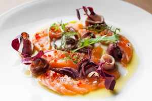 Salmon ceviche with octopus, roasted butternut squash puree, squid crackers & mixed cresses