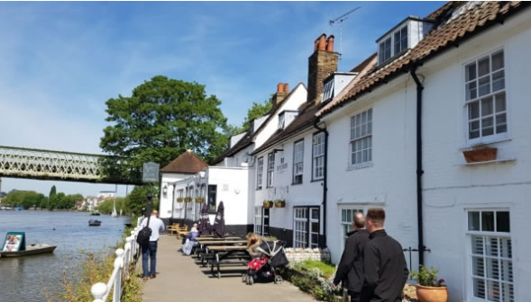 Some residents of Thames Road are understood to be concerned about possible extra noise from the new seating at the rear of the pub. The Strand on the Green Association has objected to the three benches on the footpath being replaced by three dining tables on the grounds that they will cause congestion at a narrowing section of the footpath. They also say that the introduction of two artificial trees in planters beside the door with ‘fairy lights’ would be out of character with the conservation area footpath.