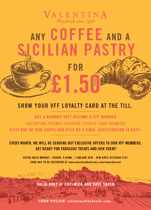This month's offer is any coffee and a Sicilian pastry for £1.50 by showing your VFF Loyalty card at the till. This offer is valid Monday - Friday 8:30am-11am and 3pm - 5pm until 31st October 2016. The card has to be activated at www.valentinafinefoods.com/rewardscard Advertisement October 8, 2016 |