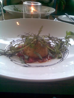 I was intrigued to hear that Michael Nadra was offering a Garden Tasting Menu to celebrate National Vegetarian Week. Michael has won critical acclaim for his cooking of meat and fish but could he rise to the occasion with pulses, fruit and vegetables? A vegetarian colleague and I set off to find out. The tasting menu is impressive with seven courses each with a specially selected wine to go with it. We kicked off with a cauliflower and black truffle velouté which was absolutely delicious and put us in a good mood for the rest of the meal , if it was all as good as this then we were in for a good time. So, little creamy appetiser over we settled down with great anticipation to see what would come next. The whole meal was a sort of gastronomic Cirque de Soleil as one pretty dish followed the other. In fact they were so beautifully laid out, like little works of art, it seemed a shame to spoil them by eating them but we didn’t let that bother us for long. The next course was salad of bulgur wheat and puy lentils with parsley, mint, pomegranates and crispy red onions. It doesn’t sound very exciting and pessimists both we expected something boring. We were wrong. With the herbs, pomegranate seeds, red onions and a swirl of pomegranate syrup the bulgur and lentils were lifted above the ordinary. The accompanying wine was a 2007 Riesling from Germany. Dish number three was twice baked goats cheese soufflé with piperade and basil, the sharpness of the pepper, onions and tomato provided just the right balance for the soufflé which was lighter and more delicate than we expected it to be. A Sauvignon Blanc from the Loire was the wine for this one and this is where I have my first and only niggle, it wasn’t cold enough for me, I like my Sauvignon icy. But my companion said it was perfectly fine by her, so there you are. Next up was a ravioli of butternut squash with pecan nuts, confit garlic and courgette tempura with a glass of a 2008 Albarino, Torroxal from Spain. Michael Nadra has an excellent track record in cooking. Before opening his own place in Chiswick (Fish Hook which he recently rebranded as Restaurant Michael Nadra) he worked in some of London’s finest restaurants; Gordon Ramsey’s Petrus, Chez Bruce, the Ebury and La Trompette. His talent with fish and meat has been well attested to and I’m delighted to say that skill has been transferred to cereals, pulses, fruit and vegetables. This is serious cooking for serious eaters and you don’t have to be a vegetarian to appreciate it. I’d challenge even the staunchest carnivore to find they dislike it Until this point all the wines had been white but that was soon to change with the next course; pithivier of wild mushrooms with asparagus, olive oil mashed potatoes and caper sauce. Our waiter made a little hole in the top of our pithiviers and poured over the sauce so it mingled with the mushrooms inside – a little theatrical perhaps but it didn’t matter.