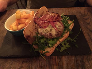 Italian Job was a beef burger in ciabatta bread served with Gorgonzola cheese, red onion, crispy Speck and rocket. You can specify how you want your beef burger cooked and the medium rare burger arrived exactly as requested. The Chicken Burger consisted of a lovely thin escalope of chicken rolled up with cheddar and herb sauce also in ciabatta. Both burgers were wonderfully juicy, the ciabatta soft and added ingredients made them wonderfully tasty. Total successes.