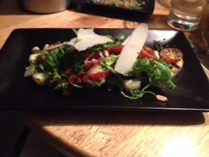 The kitchen is headed up by Michelle Lepherd who has previously worked at the River Café and she has introduced not just a European, but also an Asian style to the tapas dishes. It's a great addition to Station Parade, this particular site having been in the doldrums for a while, firstly as a fish restaurant and latterly as a cafe which closed quite a while ago. The interior is eclectic to say the least- it is like entering a tropical parlour, with palm trees, , mirrors, sofas and twinkling lamps. It is apparently inspired by Kew Gardens and the white walls and grey slate floors, give a neutral backdrop to a riot of colour in the chairs, cushions and plants. There is a bar to the left of the entrance and there are tables dotted around the front room. In the summer, the tables on the front pavement were very popular, and there is al fresco dining at the back.