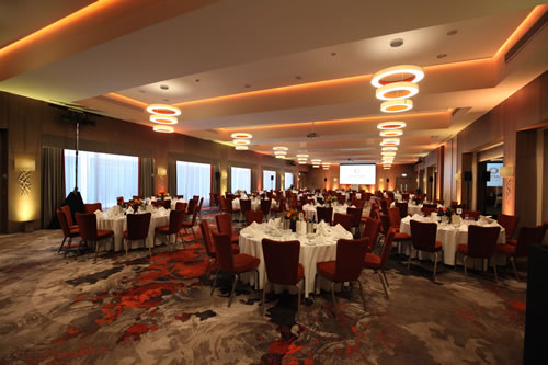The new design is aimed at creating a contemporary openness and space with a bronze and burnt orange colour scheme throughout. The interior atrium is Italian marble flooring and a huge glass chandelier has been installed. This then leads to the public space, which has also been remodelled. The events area can accommodate 400 guests in the large ballroom, along with the ten purpose-built meeting and function rooms.