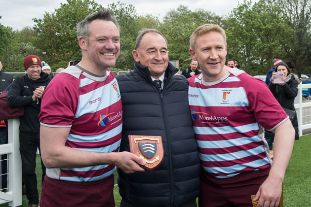 Simon Hallett and Keith Luckman, captain and vice-captain of the winning Chiswick Silverbacks team Chiswick started the second half with a try in the corner after a successful maul, Simon Allen-Clarke getting the touchdown and Snook slotting a difficult kick. Hammersmith and Chiswick each had a yellow card around this time, but there were no bad moments in this match. Snook’s kicking, with wind-assistance, began to control the match, but the home tackling needed to be good, which it was. Hammersmith were then undone as a double tackle by Snook and Harper achieved a turnover in mid-field, leading to an unconverted try by Max Burrows. With Rich Bryan and Tom Gadsby getting through a huge amount of work, and a limping Marc Copperwheat knocking holes at regular intervals, Chiswick began to look comfortable. Harper and Bunbury were solid in the centre and no-one looked vulnerable in an impressive home team. The main threat was Bowen, and Dan Purkiss did well to keep pace with him in a long race down the touch-line and slow him enough for the support to arrive in numbers. In return, Bunbury showed how it could be done, with a sprint down the other side line followed by a kick. The crowd groaned, expecting the ball to go dead. How could we lack confidence? Bunbury got it well before the dead ball line, and the crowd erupted. Snook added the points. There was still time for a rejuvenated Stewy Parmeter to crash over the line, and Snook to add the points. Chiswick team:- Barkham, Parmeter, Chraplewczyk, Copperwheat, Bryan, Gadsby, Randall, Leslie-Miller, Cox, Snook, Purkiss, Harper, Bunbury, Burrows, Lowe; Cooper, Allen-Clarke, Joyce, Roberts, Barton May 1, 2019 |