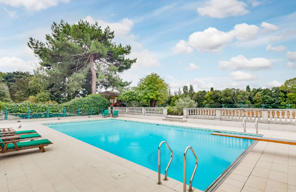 The detached gated villa-style home also has five reception rooms and six bathrooms as well a swimming pool overlooking the Thames. It has a 180 foot garden leading to the swimming pool and down to a river terrace. It is the former home of TV presenter Eamonn Andrews.