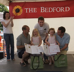 The winners of Chiswick's Greenest Dad competition were announced last weekend at Green Days. Prizes were presented by Michelin star chef (and Great British Menu finalist) Chris Horridge alongside Torin (wonder-man) Douglas. Joint-winners of the under 5yrs were Georgia Winter & Ella Chandler pictured right. The runner-up of the 5-8yrs Benedict Farley is pictured below right and the winner of the 9-12 years was Lucy Owen. Turnham Green's 2009 Green Dad Campaign this year focused on healthy eating choices. Stephen Fry said, “Turnham Green might just do what their name suggests. If you can get a busy Daddy thinking about the way they're using and spending and burning then you really can change the world. And without nagging or bullying too. Brilliant." The initiative encouraged children to adopt a greener approach to life, and in turn, influence their parents’ eco-behaviour. The theme this year was healthy eating choices which is a particularly poignant topic given the UK’s incidence of diabetes is now increasing at a faster rate than the US. With chef and nutrition training behind her, Turnham Green’s founder, Natalie is particularly passionate about this year’s campaign. “Healthy eating choices are a long term game which can sometimes feel quite intangible, this campaign aims to give children an immediate celebration of making healthy food choices. If we can inspire just one child to assess their dad’s eating choices for good health the campaign will have been a success.” Find out more about healty eating see www.turnham-green.co.uk.