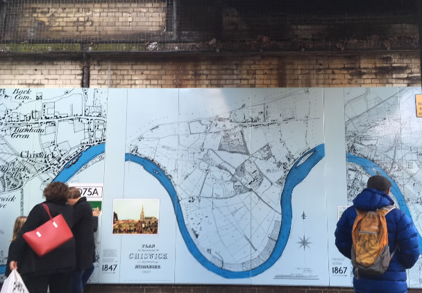 The mural is a timeline of historic maps showing the development of Chiswick through the centuries, with works of art depicting local landmarks by some of the artists who live and work in our area. The driving forces behind the 60 foot mural, which is made in vitreous enamel, were Karen Liebreich and Sarah Cruz of Abundance, who thanked all those involved in the project (see list below). "The support and encouragement of so many Chiswick locals has driven us forward over the past year," they said.