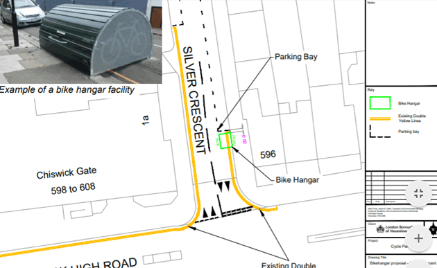 Hounslow council has recently installed its first on-street bike hangar in Chiswick at Ashbourne Grove and has received a further request from several residents on Silver Crescent. The facility costs £72 a year for a space. Bike hangars offer secure cycle parking for residents in areas where the ability to safely store bikes within a property, or within the front/rear garden, is limited. The Council says this is part of its commitment to encourage more sustainable forms of transport for daily journeys. The proposed location of the bikehangar is at the southern end of Silver Crescent, opposite Chiswick Court (1A Silver Crescent) and to the side of No.596 Chiswick High Road. The hanger is 2.5m long and just under 2.0m wide and each hangar provides storage for 6 bikes. Further information can be found on the Cyclehoop website.