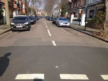 This image shows the difference in surface at the end of Brackley Road Hounslow Highways have told the locals that, "the appearance of a particular stretch of road/pavement is not always a reliable indicator of whether it should be resurfaced. In the case of the Brackley Road for example, it has thus been determined that neither the subsurface condition of the road nor the pavement has deteriorated to the point where resurfacing would be deemed necessary or prudent." "Conversely, the subsurface condition of the road on Brackley Terrace for example is deteriorating at a rate that poses a potential hazard to road users and pedestrians alike; hence our decision carry out resurfacing works this coming May.