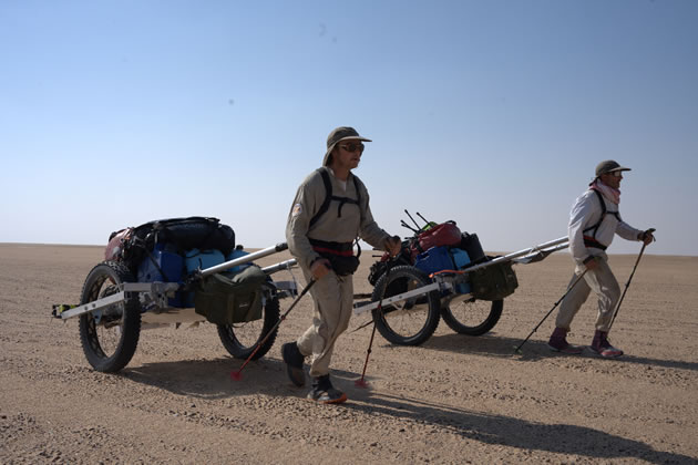 Gavin Booth and Adam Wilton pull their carts across the desert