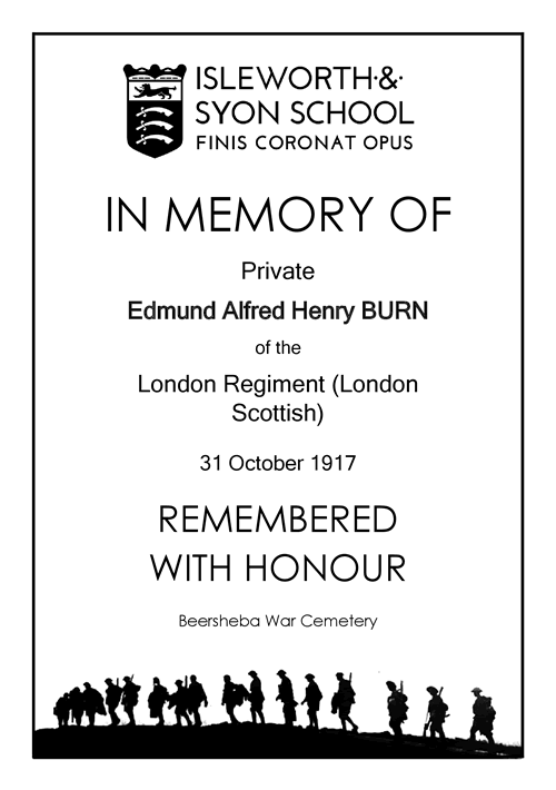 A Chiswick soldier who died in the First World War has been honoured in the Isleworth & Syon School he attended as a pupil. Private Edmund Alfred Henry Burn, lived with his family at Gunnersbury, Chiswick prior to his death on 27 October 1917. The school has completed a four-year World War I commemoration project titled ‘We Remember’, honouring 81 former students who died during the war. A website has been set up where, on each anniversary, text information is uploaded to the webpage with brief information about each fallen soldier, as well as social media posts honouring their sacrifice. The school also partnered with the local Isleworth WWI project to give further information about some of the troops who lived locally, painting vivid pictures of those individuals who battled for their country. Edmund was a Private in the London Regiment (London Scottish). He died, with honour, on Wednesday 31 October 1917. He was just 20 years old and was the son of Henry W and Rose Burn of 379 Chiswick High Road. His memorial at the Beersheba War Cemetery, 75 kms south