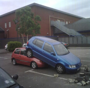 Motorists could be forgiven for thinking that Sainsbury's car park is jinxed after a second freak accident happened there in less than a month. On this occasion a blue Volkswagen Polo managed to end up on top of a red Nissan Micra even though the latter was parked in a separate car park. The incident occurred on Friday 1st May when the driver of the Polo was attempting to reverse out of a parking space in Sainsbury’s car park however, the car’s accelerator seemed to have got stuck. According to witness reports, the driver stepped hard on the accelerator, which then became unstuck without warning, causing the car to reverse at speed demolishing the low brick wall behind it and mounting the Nissan that was parked on the other side of it. This was the second incident in the car park in less than a month. The first was when a Mercedes managed to somehow 'set itself' on fire. Firefighters were called to the scene and took more than 30 minutes to get the fire under control. Thankfully no one was hurt in either incident. May 7, 2009 |