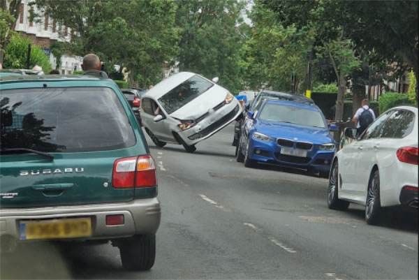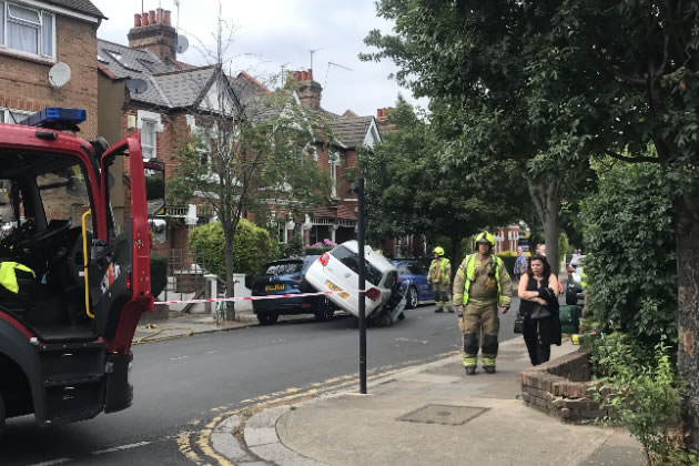 Car collides with parked vehicle after travelling on two wheels June 28, 2023 A car crashed into a parked vehicle in Chiswick this Wednesday afternoon (28 June) after somehow finding itself travelling on two wheels. It is not clear at this stage how the white Volkswagen Polo managed to end up in this position but damage to the front of the car on the right hand side suggests there may have been an earlier collision with another vehicle. No other damaged vehicle was evident at the scene at the junction of St Albans Avenue and Speldhurst Road. Three fire engines, an ambulance and a police van attended the incident. Paramedics were seen treating a man at the side of the road who appeared to be shaken but otherwise unharmed. An emergency service worker at the scene said that nobody was seriously injured and they were treating the driver of the car but it was probably not necessary to take him to hospital.