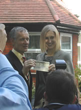 Olympic rowing champion Jack Beresford has been commemorated with an English Heritage Blue Plaque at 19 Grove Park Gardens, also known as Belfairs, where he lived from 1903 to 1940. The unveiling took place on 16th August with the Blue Plaque unveiled by his son, John Beresford. The picture to the right shows John Beresford and Tracey Boorman of English Heritate holding a postcard showing Jack Beresford with his fellow sculler Dick Phelps in the 1930s which Jack sent to his mother at Belfairs. This was brought to the event by Phelps' son and given to John Beresford to mark the occasion. It was during the time that he lived in Chiswick that Beresford competed in an astonishing five Olympic Games, most significantly the infamous Berlin games of 1936, where, at the age of 37, he won the double sculls with Dick Southwood ahead of the German crew; Beresford later described it as “the sweetest race I ever rowed in”. Beresford won gold in the single sculls in 1924, coxless fours in 1932 and double sculls in 1936, as well as silver in the single sculls in 1920 and the eights in 1928. He was awarded the Olympic Diploma of Merit in 1949 and managed the British rowing team at the 1952 Olympics. His father won an Olympic silver medal in the eights in 1912. His record of competing in five consecutive Olympic Games, and winning five gold medals at three of those games, has only been surpassed by Sir Steve Redgrave. It is likely that he would have competed in the games scheduled for 1940 which never took place due to the war which would have meant the establishment of a record never likely to be beaten. August 16, 2005