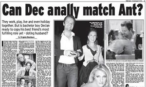 Ant and Dec inadvertently became the stars of what has been dubbed ‘accidental headline of the year’. The first edition of Saturday's Daily Express carried the headline "Can Dec finally match Ant?" on a two-page article about the pair, in particular Dec’s blossoming relationship with Sky TV presenter Georgie Thompson, with the word "finally" crossing over the two pages. Apparently the Express powers that be decided there were too many headlines with "finally" in the edition so it was changed to "Can Dec at last match Ant?" Unfortunately somewhere in the process, someone forgot to change both sides of the spread, leaving the "a" of "at" on one page and "nally" of "finally" on the other, creating the headline "Can Dec anally match Ant?" which was published in some editions before the error was corrected for the final one.
