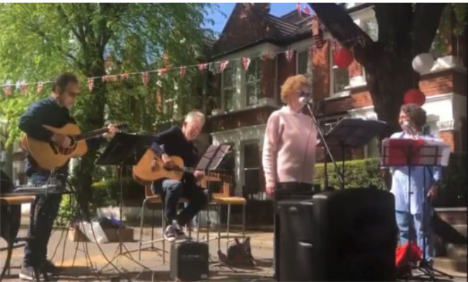 That's where our band, 'A Wing and a Prayer' came in. We had played at last year's Jubilee street party and were more than happy to do the same again. At the Jubilee party we had played on the footpath in front of our house. This time because there were skips immediately However, once the tables were in place, that position would have left us isolated from everyone else. Instead it was suggested we set up closer to the tables. This we did by moving our equipment off the footpath and out into the middle of the road. Blessed by sunny weather, the party was quickly under way. Our road is like many in Chiswick where you know the neighbours on each side of you but that's about it. Here was the perfect opportunity to meet some of the unfamiliar faces living behind the doors you walk Easing the introductions were the tables full of the food and drink each household had contributed. After everyone had had their fill, our two sets of music provided a backdrop to the myriad of conversations that continued long after our final number. One impressive part of the event was the number of people who mucked in to clear up at the end of the day. The following morning only the bunting remained as evidence of the hugely enjoyable affair a day earlier.