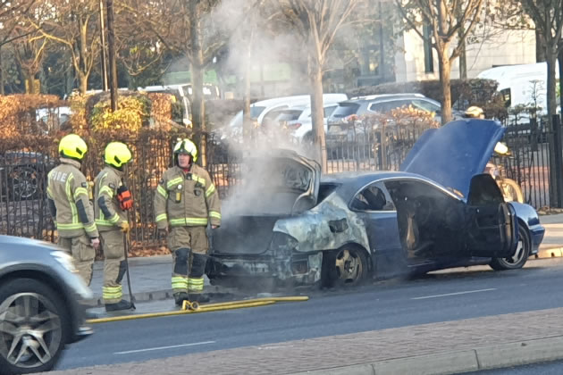 London Fire Brigade attended the incident to douse the blue saloon car.