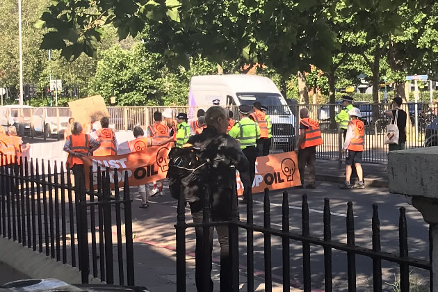 June 14, 2023 There was substantial traffic disruption in the Chiswick area this Wednesday morning (14 June) due to a Just Stop Oil protest on Chiswick High Road. Around a dozen demonstrators started a slow march shortly before 8.03am on the southbound carriage way of the road close to the junction with Wellesley Road. As they proceeded towards Kew Bridge passing the junction with Stile Hall Road they used a megaphone to spread their message as well as handing out leaflets. There was an angry response from some of the motorists stuck on the queues of traffic that reached up to Chiswick Roundabout but some residents shouted support for the demonstrators when arrests were being made. The police say that they imposed Section 12 conditions under the Public Order Act at 8.15am and the road was cleared six minutes later. The imposition of these conditions can be made by the senior officer on the scene if he or she believes it is necessary to prevent disorder, damage, disruption, impact or intimidation. Two of the demonstrators refused to comply with the conditions and were arrested. It is the eighth week of daily action by the Just Stop Oil group who also held a slow march north of Chiswick Roundabout a few days earlier. It is calling on the government to halt all licences and consents for new oil, gas and coal projects. Around 600 people from all over the UK have taken part in the marches of whom 95 have been arrested and 40 charged. 74-year-old Anne Taylor 74, a former teacher from Oxford, who took part in a protest on Tuesday said, “My fourth grandchild was born on 21st May. So gorgeous, so tiny and defenceless. She’s just weeks old now and I will do anything I can to help ensure a liveable future for her. As a former teacher, young people really matter to me. I will absolutely do what I can, non-violently, to try to protect the future of my grandchildren, and all young people all over the world. “This government is breaking the law. We are trying to non-violently uphold the law. “ The Metropolitan Police says that the cost of policing these protests so far has been £4.5 million.