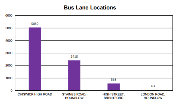 During the year there were 5050 fines issued on Chiswick High Road for bus lane violations, more than those given for all of the rest of the borough combined. This is a fall from the previous year but the main reason for the sharp decline in bus lane fines issued is a reduction in the number given at Staines Road, Hounslow, which more than halved. The number in the report does not include bus lane fines on Chiswick High Road issued on the section south of Chiswick Roundabout which is controlled by Transport for London.