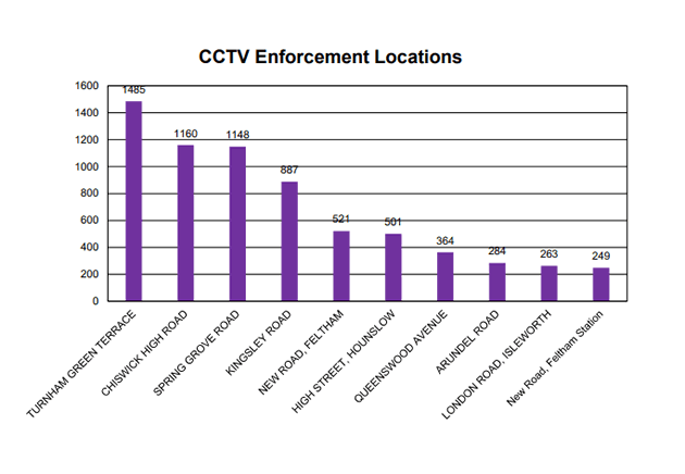 Turnham Green Terrace remains the road in the borough with the highest number of PCNs enforced by CCTV with 1485. A significant number of those are believed to be for people pausing to drop off passengers near Turnham Green Station. This actually represents a fall from the previous year when over 2,000 such fines were issued. The second highest number of PCNs from this source is for Chiswick High Road with 1160.