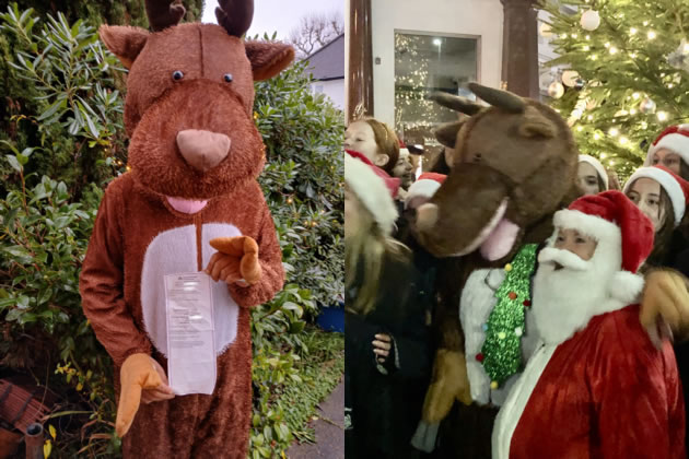 On the evening of the Chiswick Lights Switch-on, taking a detour from their usual very busy pre-Christmas present-wrapping at the North Pole, Santa and Rudolph flew in and parked in the town’s main car park. They had volunteered to bring festive cheer and mince pies to local children and Chiswick School singers.
