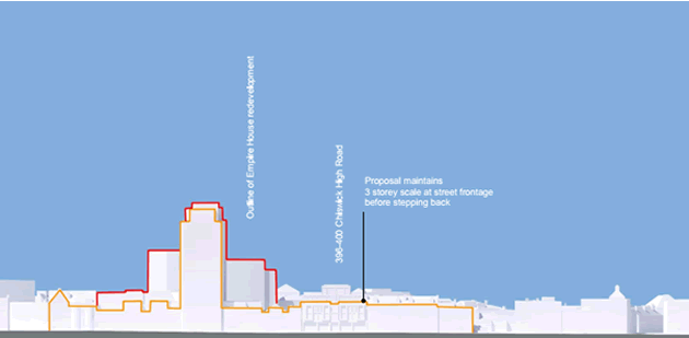A plan to develop a neglected stretch of the High Road with a flats and retail space near Empire House, has nothing to do with the Lendlease development or Sainsbury's, and is a totally separate project, the Chiswick Area Forum has been told. A pre-application presentation for 396-400 Chiswick High Road outlined plans to regenerate the units currently occupied by Carpet Right and Daniel Beds. The proposal is for 22 units of 1,2 and 3 bedroomed apartments over 4/5 storeys, with retail space at ground level. The plans envisage the development to be built in a quasi pavilion style maintaining a three-storey elevation at street level before stepping back. The current units are two-storey high buildings with the top storey vacant. Richard Brown, of Keith Williams Architects, said they planned to create a building which would positively enhance the area not only fronting onto the High Road but towards the rear. There would be a percentage given over to affordable housing. He said development would be very careful to conserve the look of the area. While plans were not available, it was likely to be built in brick, and be in keeping with many of the listed buildings in the vicinity, such as Arlington Mansions.