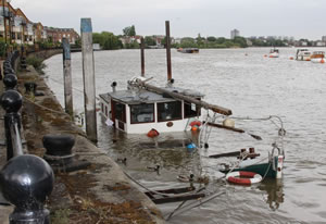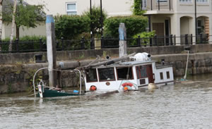 The boat was originally being towed from Staines down to Essex when there was a problem with the "tow" and she sprang a leak. She was initially moored at the pier for a couple of weeks to effect emergency repairs but during that time the Port of London Authority (PLA) examined the state of the boat and decided that if she continued her journey it would be a serious risk to navigation and prohibited further travel downstream. It was then moved to the wall where it has been ever since, initially somebody was around fairly regularly apparently starting repairs but more recently there does not appear to have been any activity. Local resident Alan Wadner has been told that the PLA will be coming to secure the loose bits from the wreck. Now that the boat is no longer floating they do not need a court order. A spokesperson for the PLA said, "The craft is no longer afloat, though it is currently safe on its mooring lines. Because it is safely secured to the wall, it does not present any immediate danger to other river users."Nevertheless, PLA teams have been aboard and removed floating objects to prevent debris entering the River. Similarly we have taken steps to minimise the risk of any pollution - eg of diesel oil from its engine." |