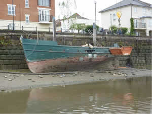 The boat was originally being towed from Staines down to Essex when there was a problem with the "tow" and she sprang a leak. She was initially moored at the pier for a couple of weeks to effect emergency repairs but during that time the Port of London Authority (PLA) examined the state of the boat and decided that if she continued her journey it would be a serious risk to navigation and prohibited further travel downstream. It was then moved to the wall where it has been ever since, initially somebody was around fairly regularly apparently starting repairs but more recently there does not appear to have been any activity.