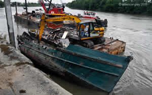 PLA contractors General Marine installed their crane platform near Chiswick Pier on Friday 3rd June. They plan to start work on Monday and estimate that it will take around a week to remove the boat as they reckon it weighs around 40 tons and needs to be dismantled and removed in parts.