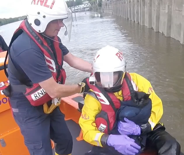 At 2.22pm on Sunday 7 June 2020 Chiswick Lifeboat launched to a cat stranded on the foreshore between Chiswick Pier and Chiswick Eyot. The crew had spotted a black cat in distress on a rapidly diminishing patch of shingle at the foot of a 6m high river wall. They were concerned that one of the crowd of onlookers was going to put themselves in danger in an attempt to rescue the cat. The crew have rescued many dogs who are usually glad to see their human rescuers, but cats display very different behaviour. This cat greeted the crew by snarling and spitting, and then tried to climb the sheer wall. He then wriggled out of the clutches of RNLI crewman Mark Pusey and started swimming away. Mark waded after him and, after some gentle encouragement, managed to wrap the cat in a blanket and took him into the lifeboat. This brought on cheers from onlookers who had assembled on the Thames Path. The cat was brought ashore shore and released unharmed. In true Tom & Jerry-style, the cat then shot off ‘stage left’ pursued by a dog. RNLI Helmsman James Anthony explained ‘The RNLI crews often rescue animals in order to prevent their owners from putting themselves in harm’s way. On this occasion we were just in time. The little strip of foreshore was completely covered by the rapidly rising tide by the time the cat was brought ashore.’ Mark Pusey added ‘This incident had a good outcome but does show how easily the fast flowing tides can turn a benign environment into a very dangerous one. If you see a person, or an animal, in trouble in the water please call 999 immediately and ask for the coastguard. The RNLI lifeboats on the Thames can be at any incident in minutes.’ Chiswick RNLI lifeboat station is the second busiest in the UK and Ireland. Since The RNLI search and rescue service on the Thames started in 2002, Chiswick Lifeboat has attended over 3,500 incidents and rescued over 1,750 people. The RNLI is entirely funded by public donations.