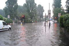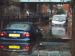 Many roads and streets in Chiswick flooded this Tuesday as a violent thunderstorm was accompanied by an exceptionally heavy fall of rain. Estimates are that up to 1.5 inches of rain fell in a half hour period a level that would normally be high for the whole of the month of July in London. The storm overwhelmed the existing water infrastructure and Thames Water was forced to pump untreated sewage into the Thames before it was forced onto residential streets through manhole covers. This has caused the deaths of tens of thousands of fish causing destruction to the local Thames eco-system that will take years to repair. The storm hit West London worst of all with reports of massive hailstones hitting Hammersmith reminiscent of a scene in the recently released film on global warming, 'The Day After Tomorrow.' In Hyde Park 3 teenage girls were reportedly hit by lightening with one having to be resuscitated by paramedics. Car alarms across town were set off by the storm and office workers and householders struggled to save buildings from the effect of flooding as drains proved unable to cope with the rapid fall of rain. Fishers Lane was completely flooded and cars were unable to pass.