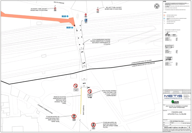 A plan has been drawn up by Ealing Council for access restrictions at the underpass on Fishers Lane in Chiswick. A local councillor has been told that a traffic order will be published next week with closure scheduled for 27 July or soon after. Funding from Transport for London has not yet been confirmed. The plan would see all vehicles but buses and pedal bikes being forbidden from using this section of the road. The designs are described as being part of the East Acton to Chiswick Cycleway Post Covid-19 Response. The design shows that signage will be placed on South Parade indicating no left or right turn depending on the direction of approach and road markings will be placed to raise motorist awareness of cycles. On the southern side of the bridge the parking bays next to the playground are to be removed and replaced with double yellow lines. It had been predicted for a while that Hounslow’s plans to restrict access on Turnham Green Terrace would require the closure of the Fishers Lane underpass as it would be unable to handle the volume of displaced traffic and would direct flow to the junction of Chiswick High Road and Fishers Lane which is already one of the most dangerous in the area.
